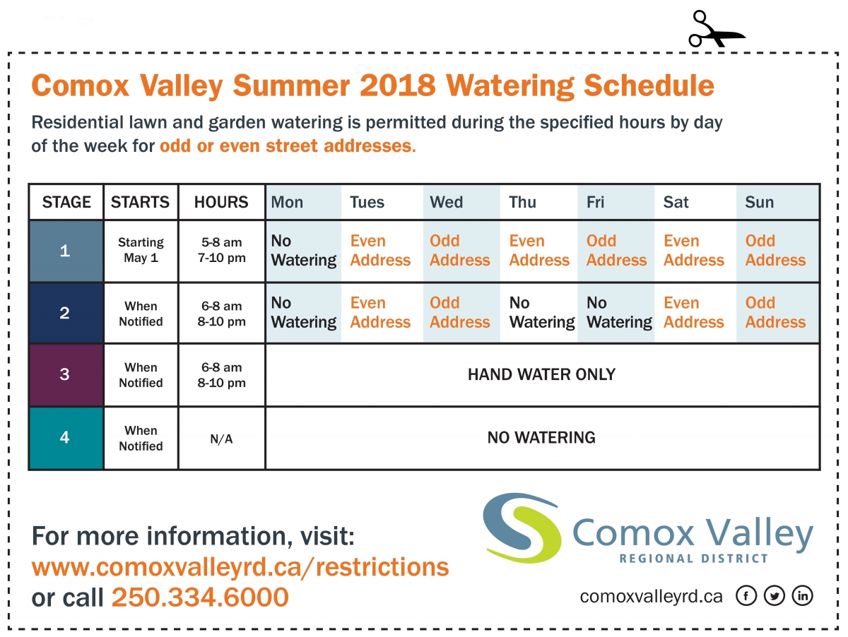 Residents are encouraged to watch their local newspaper for a removable watering schedule that will be available over three editions of the paper beginning on April 19. The calendar can also be downloaded at www.comoxvalleyrd.com/restrictions.
