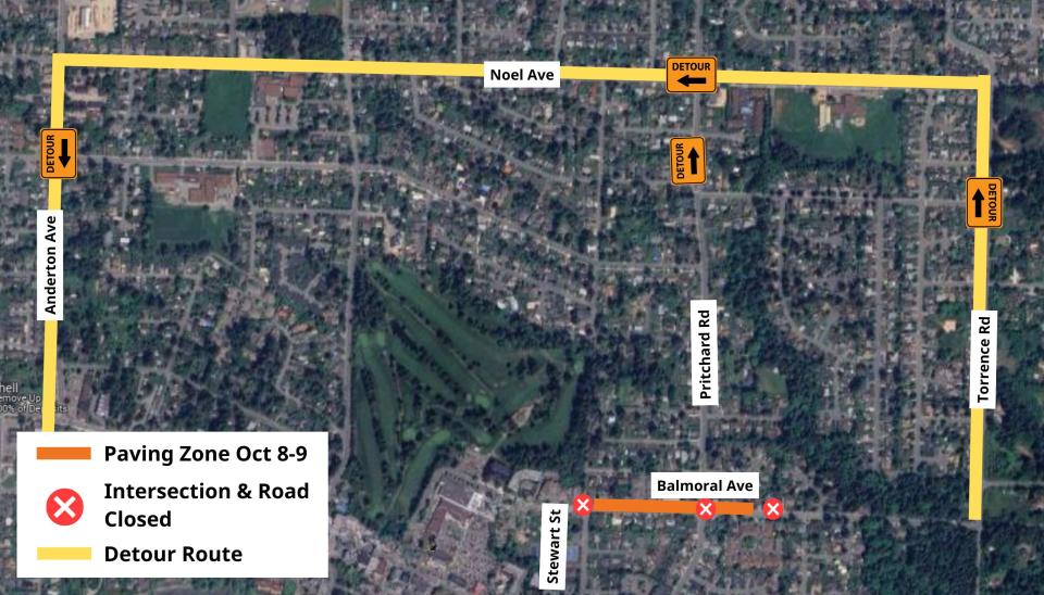 - October 8 - October 9: The intersections of Stewart Street and Balmoral Avenue and Pritchard Road and Balmoral Avenue as well as Balmoral Avenue to Donovan Drive will be closed for preparation and paving. (MAP 4)These works will be conducted during the hours of 7:00 am until 8:00 pm, Monday to Friday. To ensure the safety and convenience of commuters, detour routes will be clearly marked and supported with traffic control personnel.