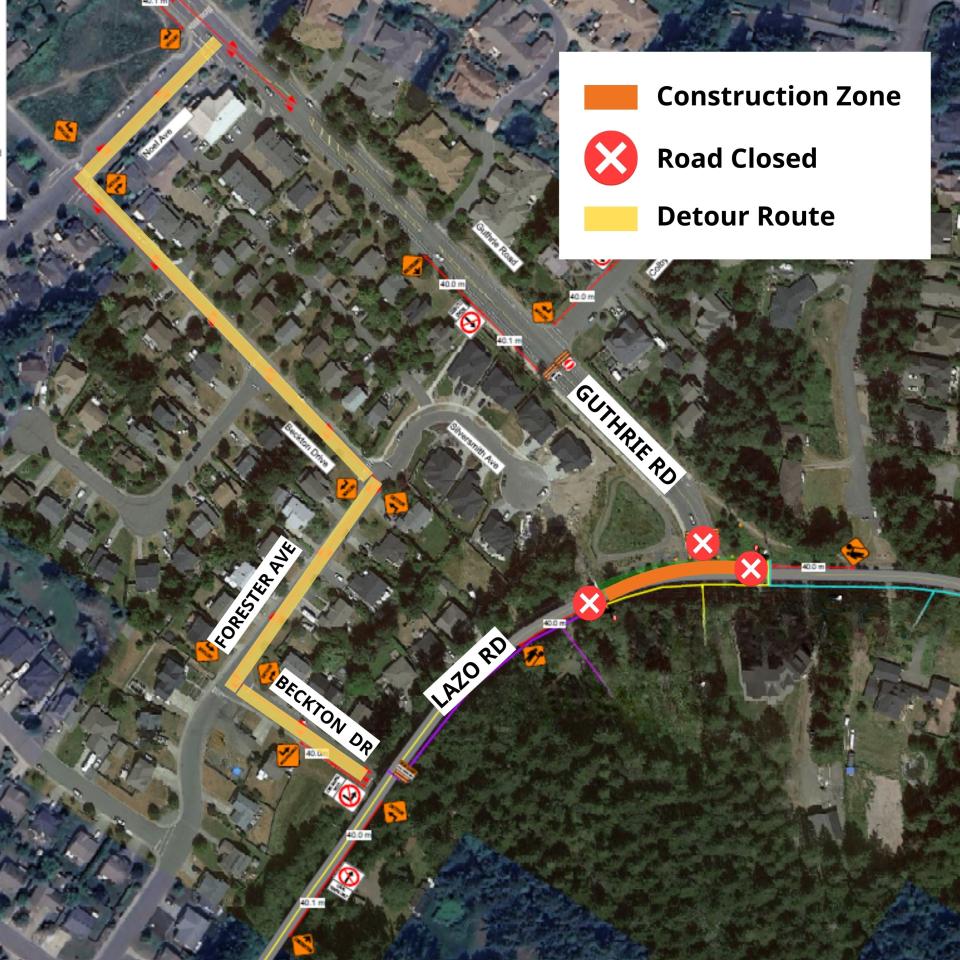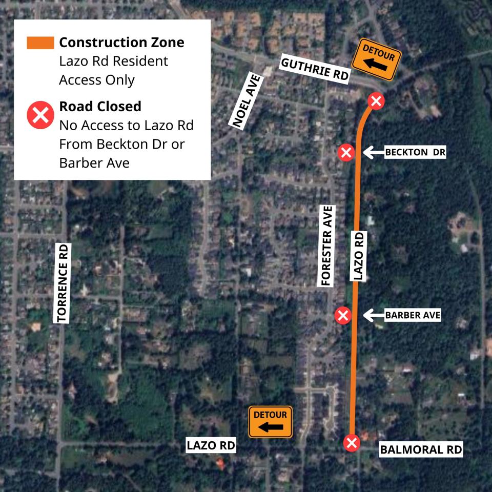 Lazo Road will be accessible to residents only. Neighbourhood residents who do not have property access on Lazo Road, between Guthrie Road and Balmoral Road, are asked to use alternate routes to access their homes.