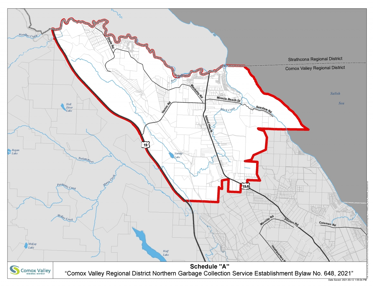 The proposed Northern Garbage Collection Service consists of a portion of Electoral Area C (Puntledge - Black Creek) as shown on the map below. The CVRD has also developed an interactive service area map to assist residents with confirming their eligibility.