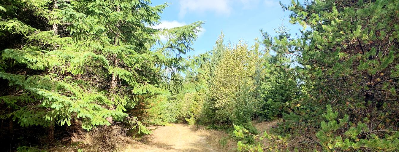 The 4-6 meter wide gravel, multi-use trail runs through a recently logged area of Denman Island. The surrounding trees are a mix of young Lodgepole Pine, Western White Pine and Douglas fir. As with the rest of the Northeastern side of Denman Island the trail lies on the Quadra sand cliffs and is very dry with very sandy soils.